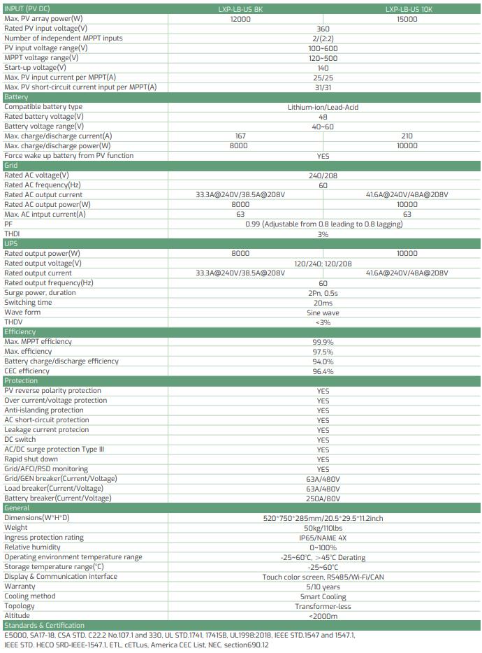 Datasheet của Inverter Hybrid Luxpower 8kW Split Phase LXP-LB-US 8K: